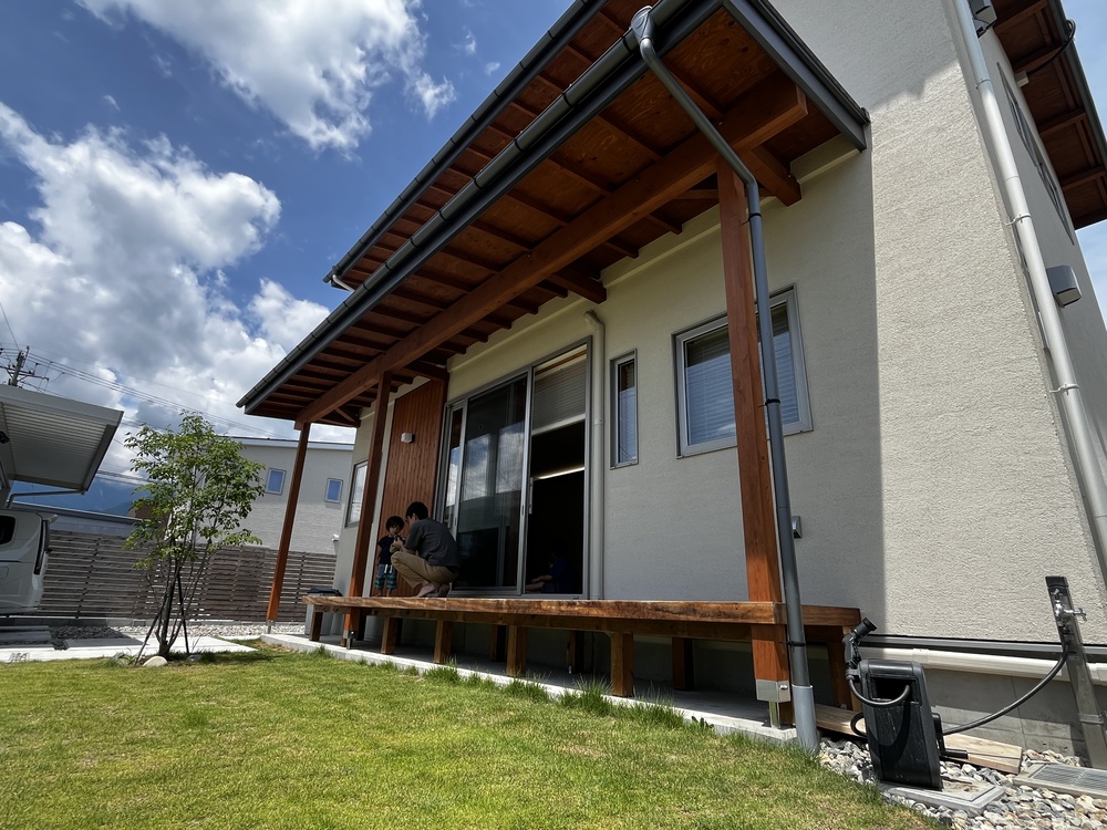 私もウッドデッキに腰を下ろして、夫と⼀緒に⼦供の動きに注⽬してみる。