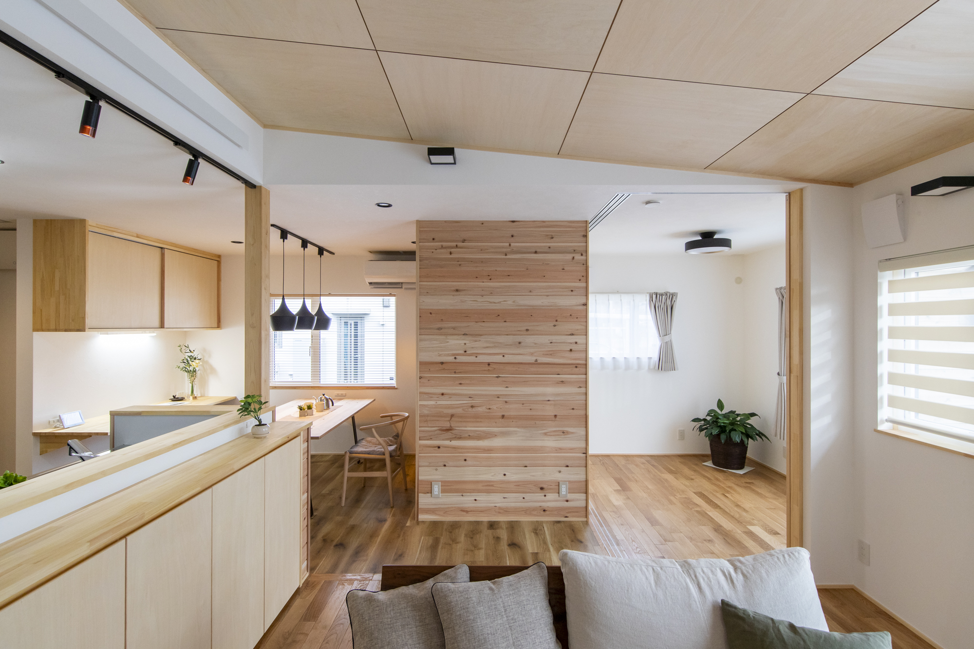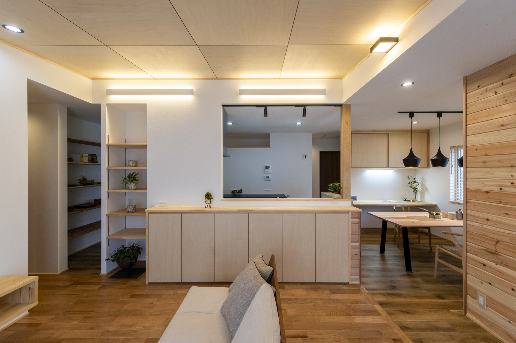 キッチンを中心に家族がリビング、ダイニングそれぞれの居室でくつろいでいても、
