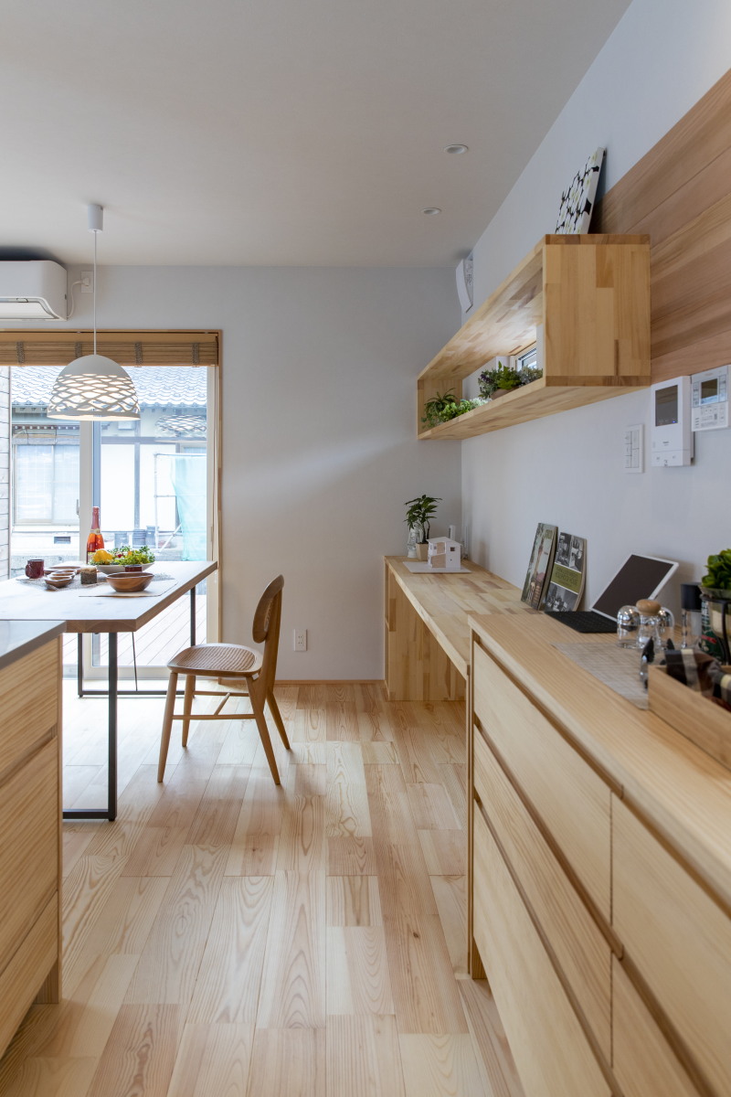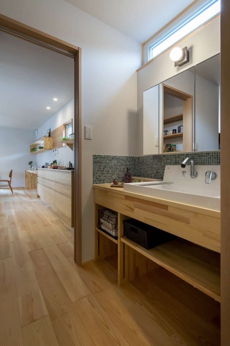 キッチンから横一直線で、洗面台、脱衣室へとつながる動線。
