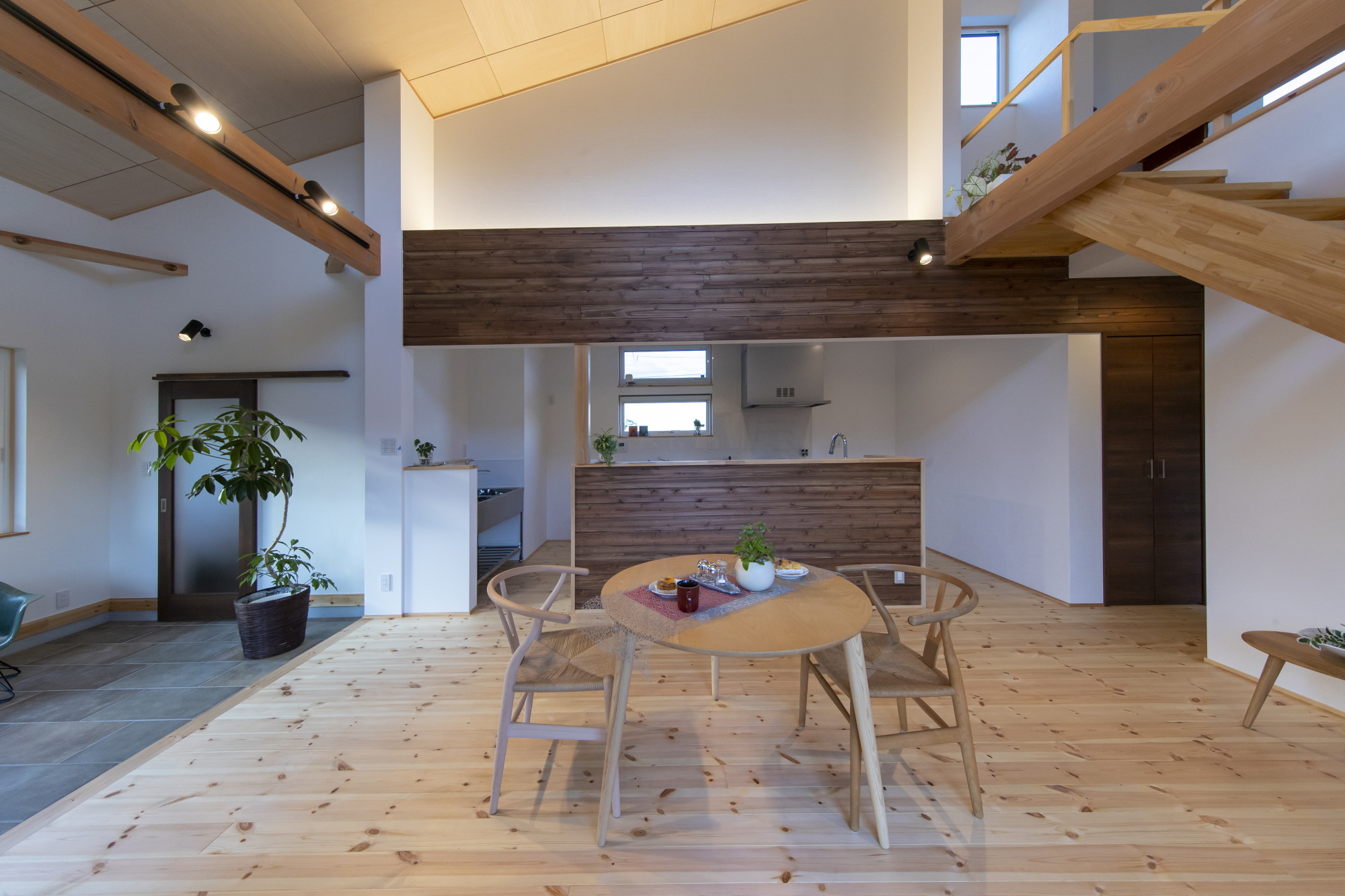 リビングダイニング空間に大きな土間を連続させて、