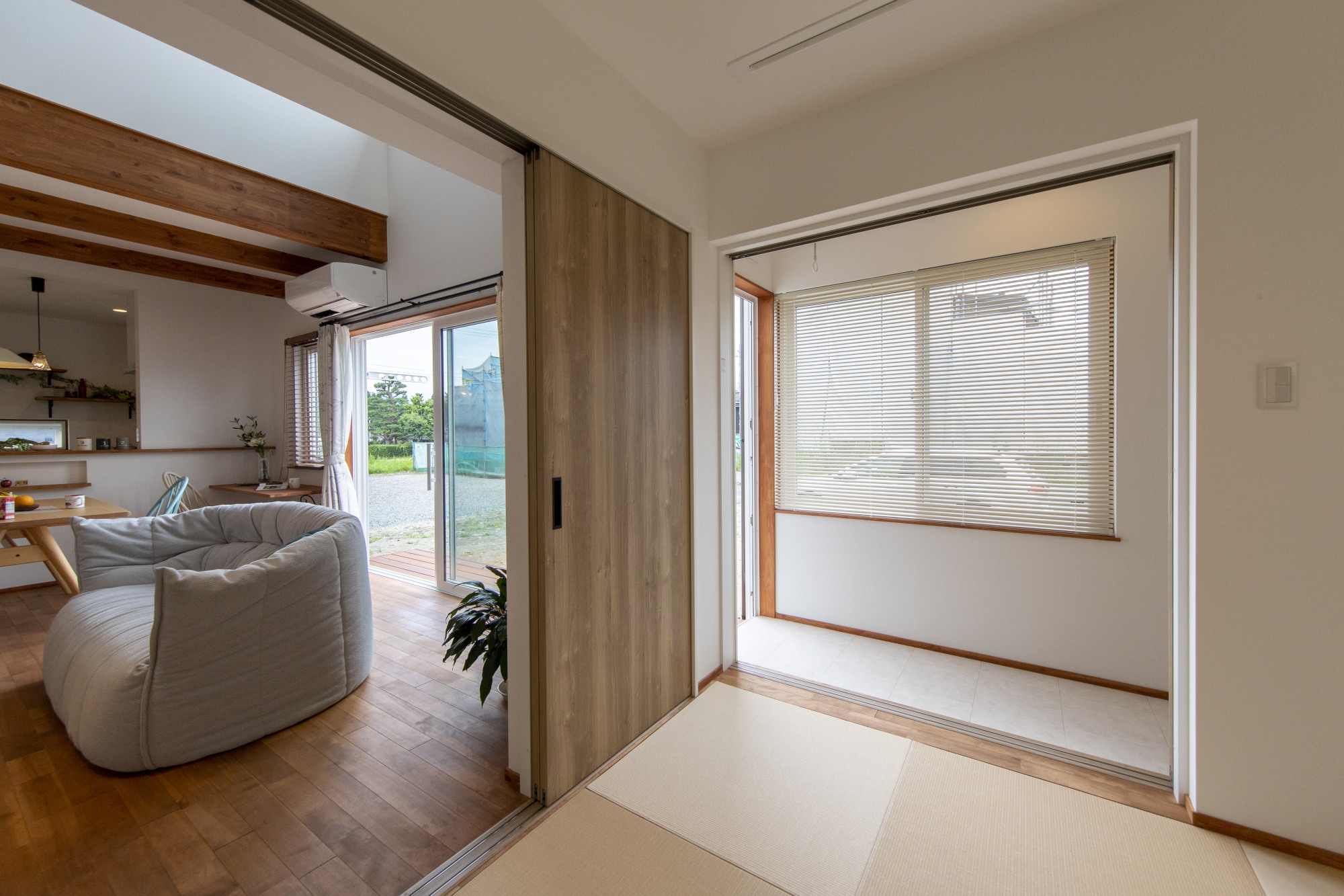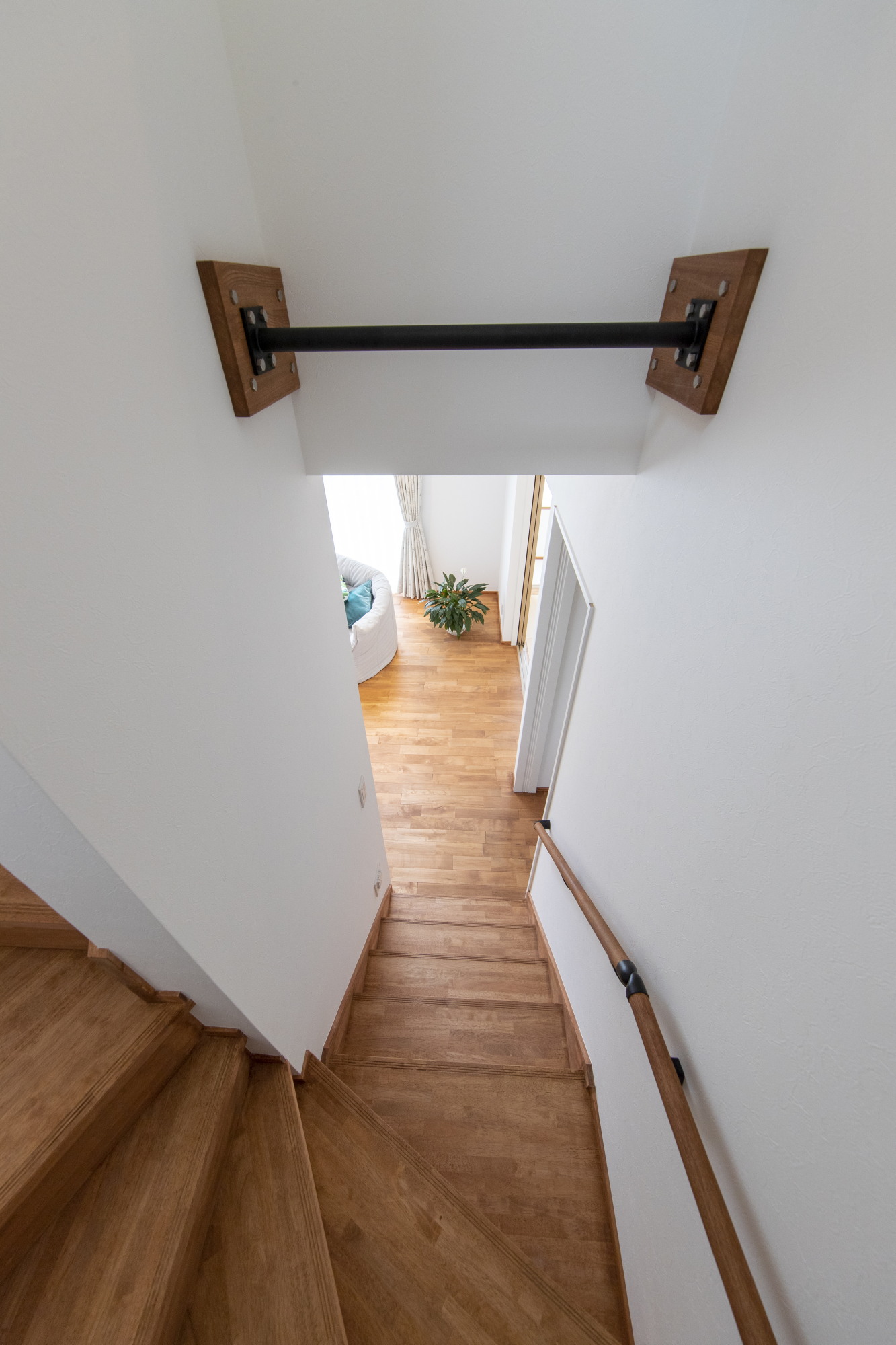 朝、タタミでストレッチできる室内物干しのある家事楽な家
