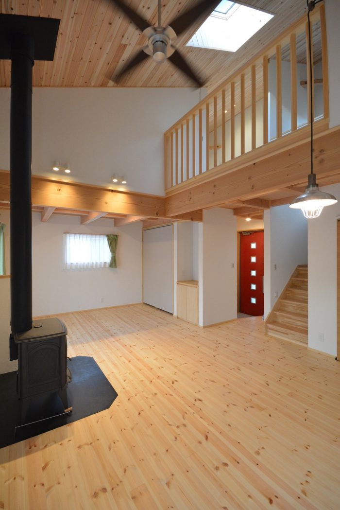 吹抜けに薪ストーブのある家