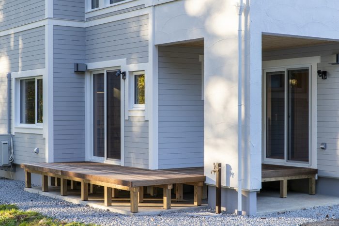 外壁に板張りを採用し、 板張りに着色を採用しているので、 板張りの様子が、がらりと変わっていきます。 グレーと、白のコントラストが効いた外観になる予定。 少...